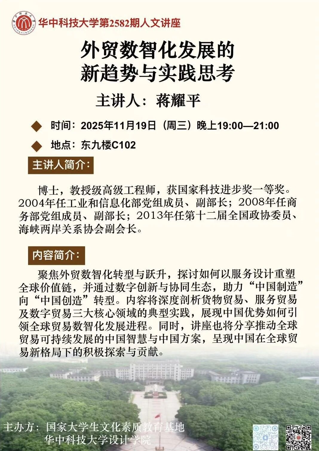 2025年11月19日晚,商务部原副部长蒋耀平教授应邀做客第2582期人文讲座。他以“外贸数智化发...