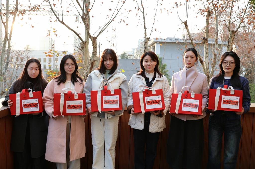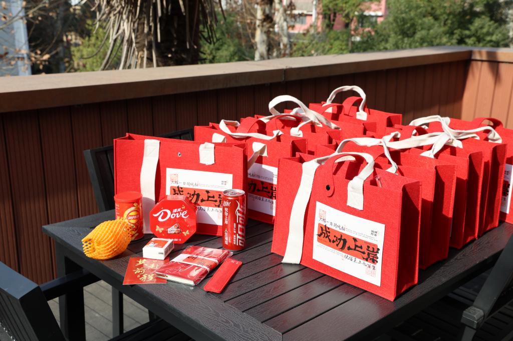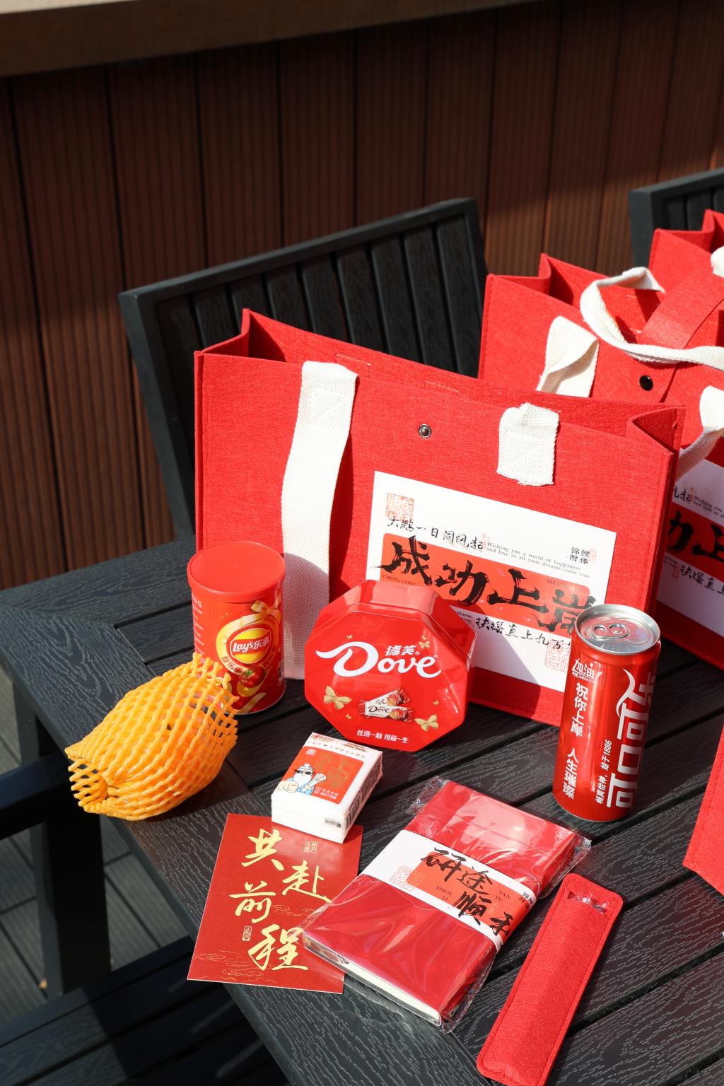 公司精心筹备的大礼包饱含深意,定制姓名专属可乐承载着“金榜题名”的祝福,巧克力为学子补充能量,橙子捏捏乐助力缓解压力,搭配“成功上案”手提袋和实用的本子、笔、纸巾等物品,为公司考研学子们送上温暖的祝愿。