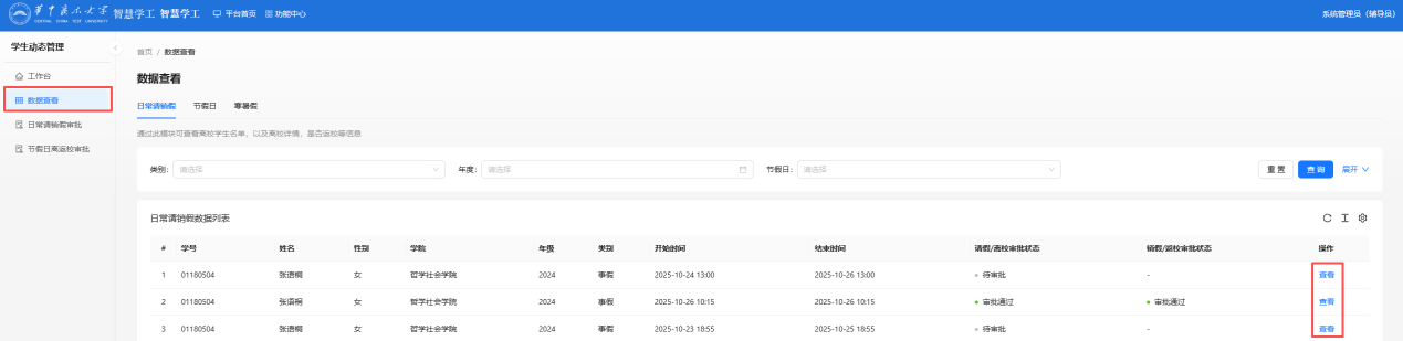 数据查看:可对“日常请销假”的所有记录进行查看。搜索条件可以“展开”,多条件组合查询。