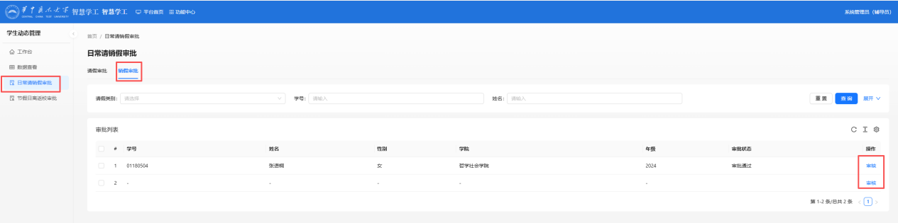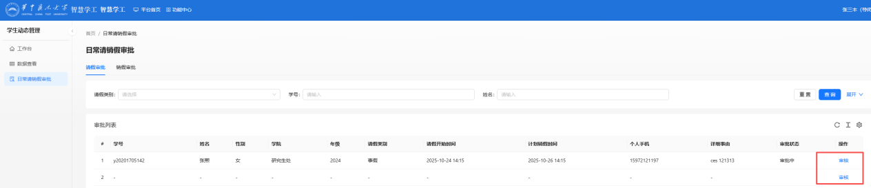日常请销假:可直接查看当前请假待审批和销假待审批信息,点击每条记录后的“审核”,可进行审核。