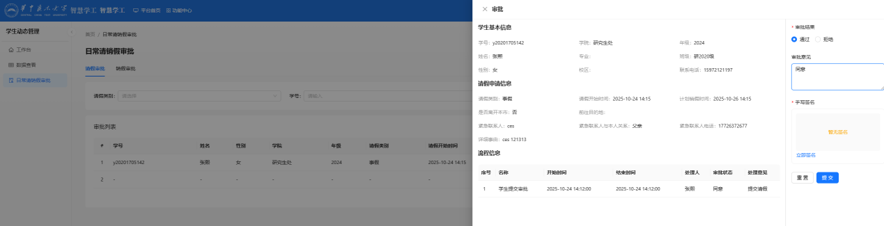 2、请假大于3天。研究生导师审核后,教务员审核、辅导员审核,院系分管副经理审批,并抄送给院系副书记和辅导员。